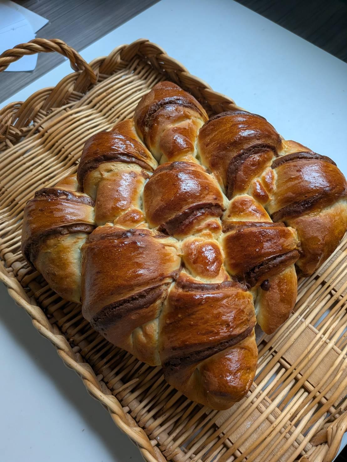 コーヒーフィリングとチョコチップを巻き込んで9個のバターロールに成型し20㎝の角型にぎゅうぎゅうに詰めてちぎりパンを焼きましょう!